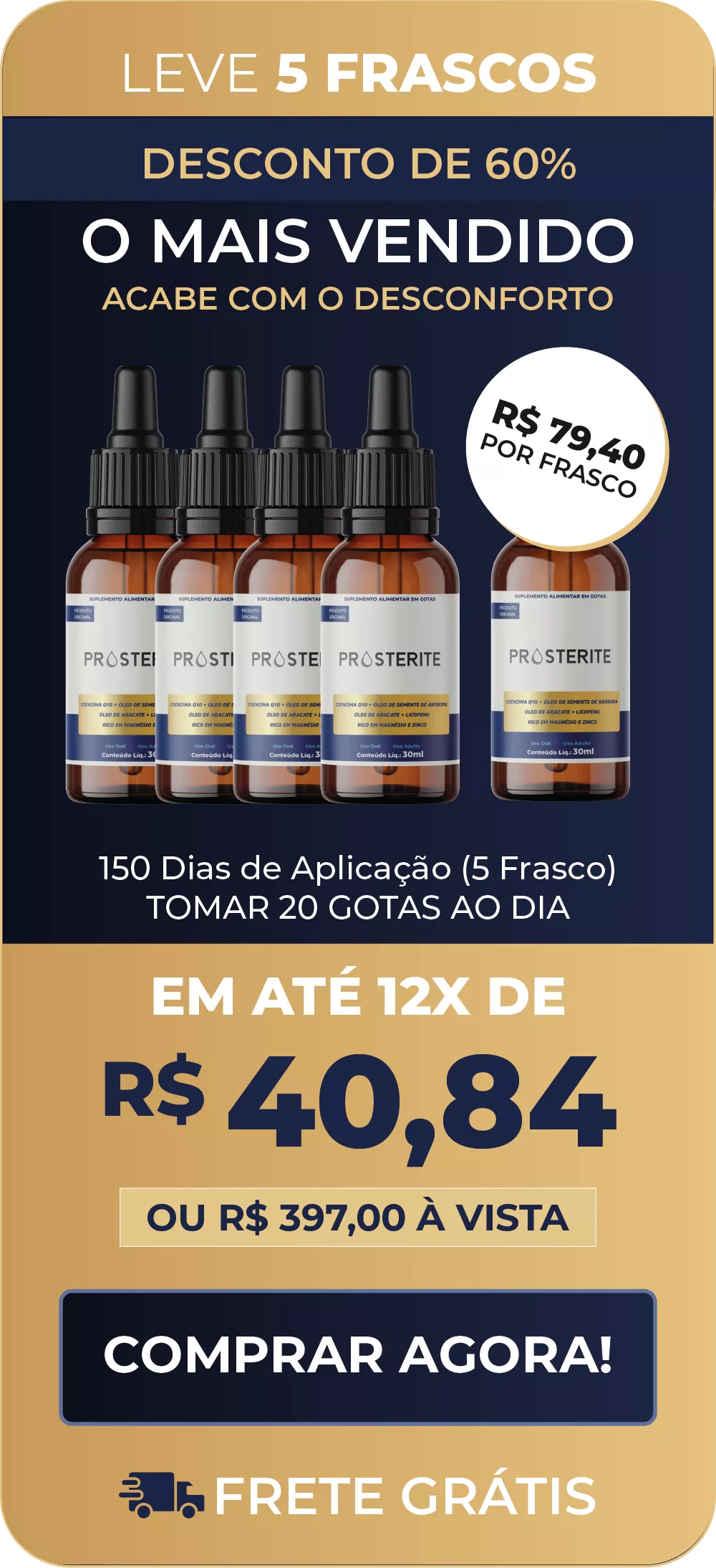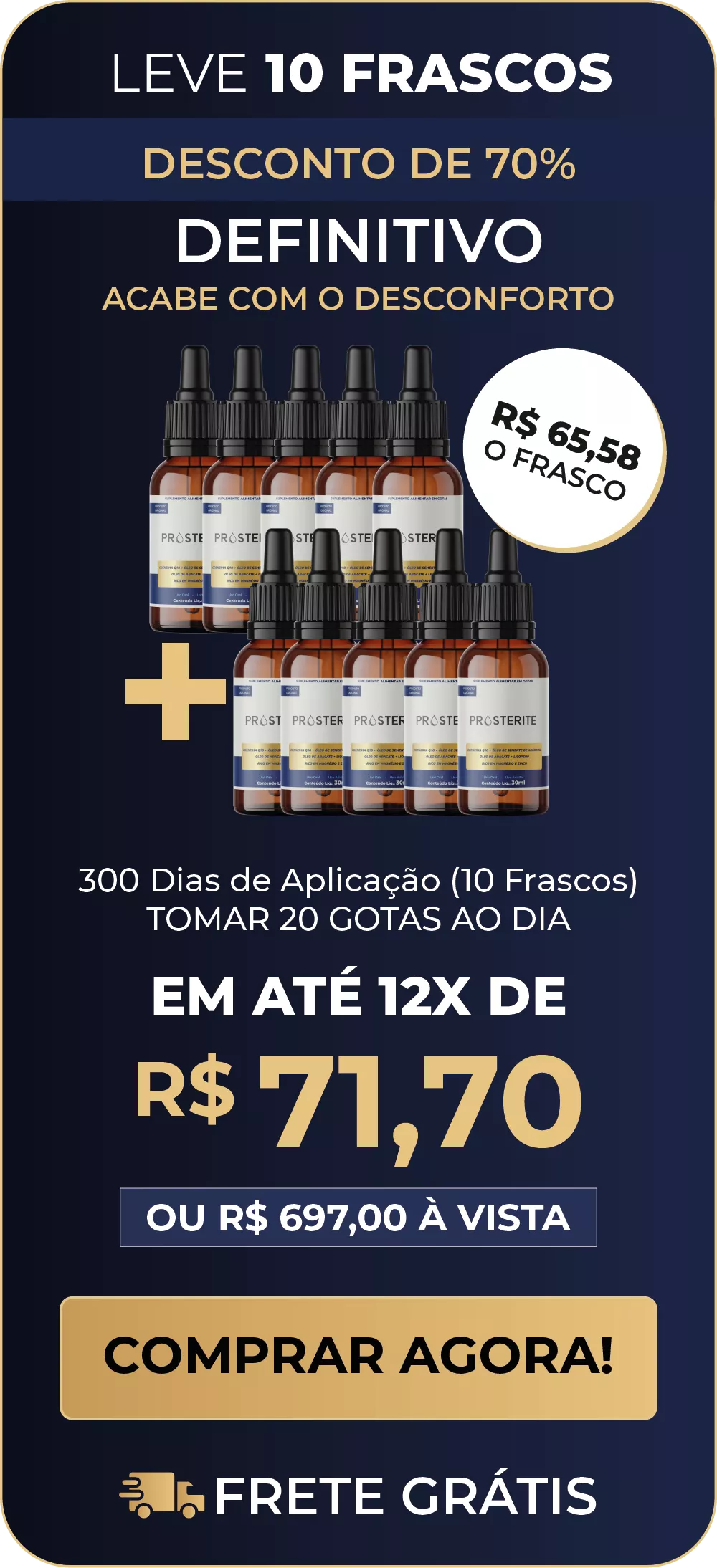 Temos total confiança na eficácia do PROSTERITE. Se, por algum motivo, você não estiver satisfeito com o produto, poderá exercer o seu direito de arrependimento em até 30 dias após a compra e ter seu dinheiro de volta, mesmo que já tenha utilizado todo o produto.